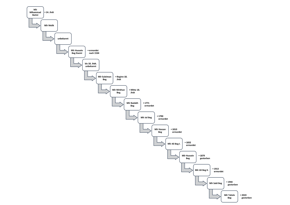 The family tree of Mir Tahsin Beg is – at least in written form – badly handed down before the beginning of the 18th century, with one exception. From the 18th century, however, it is extensively and also in written form handed down, which is why the direct succession in the family tree is considered here only: