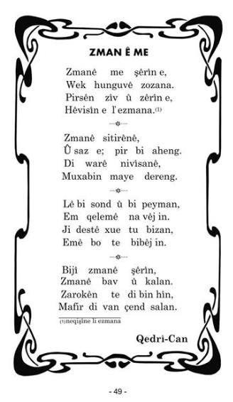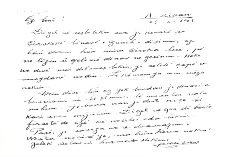 Kula welat, çima holê giran û ji bîr nabe? Heta niho me digot: Em bê der û poxan in, ji lewre hergav birînên me diaxivin û ji hesreta erdê û kalan û bavan em dîn dibin, vêca me çi divê? Gund gundê me, bexçe û baxên me. Tekûz e, hertişt, hertiştê me!