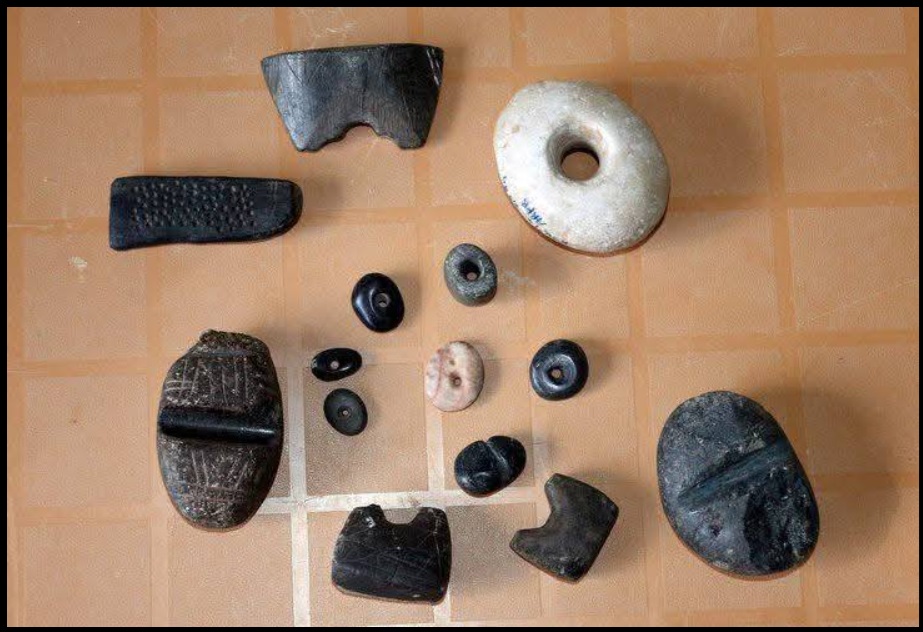 Ayrıca kazılarda balık avlamada kullanılan, modern olanlarına benzeyen kemikten oltalar, taş aletler, baltalar ve üzerinde dinsel inanışları simgeleyen figürlerin yer aldığı eşyalar bulundu.