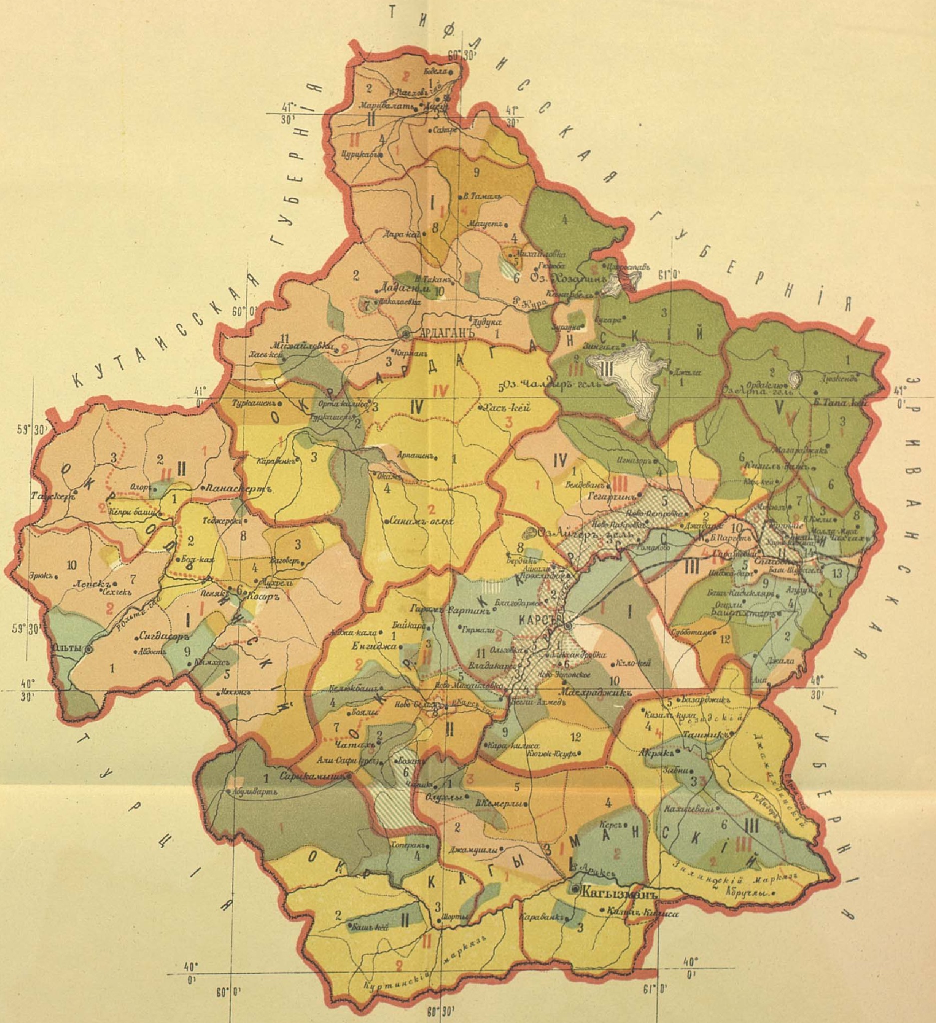 Kars ilinin Ruslar döneminde 1902 yılında yapılmış etnik haritası. Kuzeyde Ardahan, batıda Oltu ve komşu ilçeler dahil.