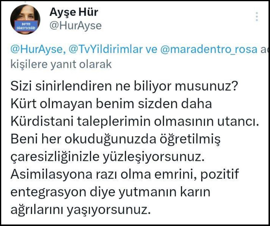 ''Kürd ulusundan başka diğer bütün dünya milletlerinin kendi kaderini belirleme hakkının olduğunu'' savunuyor''