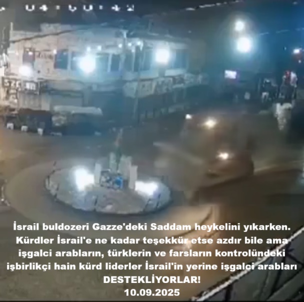 İsrail buldozeri Gazze'deki Saddam heykelini yıkarken. Kürdler İsrail'e ne kadar teşekkür etse azdır bile ama işgalci arabların, türklerin ve farsların kontrolündeki işbirlikçi hain kürd liderler İsrail'in yerine işgalci arabları DESTEKLİYORLAR!