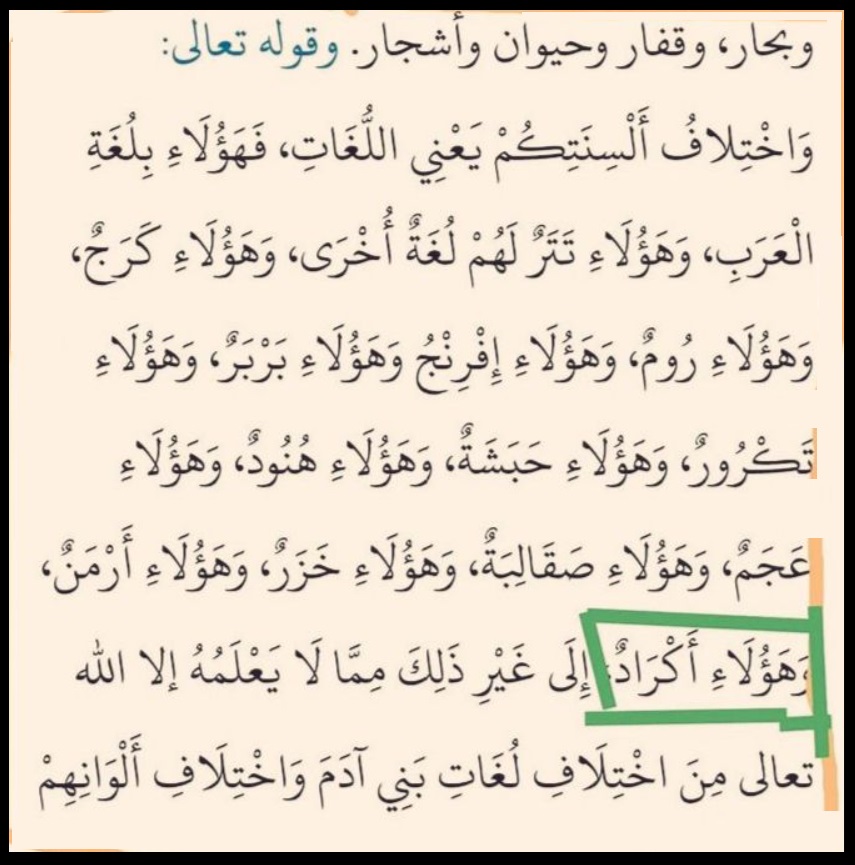 Han nämner det kurdiska språket i sin tolkning. Ibn Qahir dog år 1373 e.Kr.