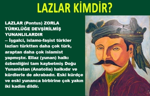 İşgalci-asimilasyoncu ırkçı türklük devleti Türkiye yunanlıları (batı Anatolya rumları ve lazları yani), ermenileri türklüğe tam çevirmiş.