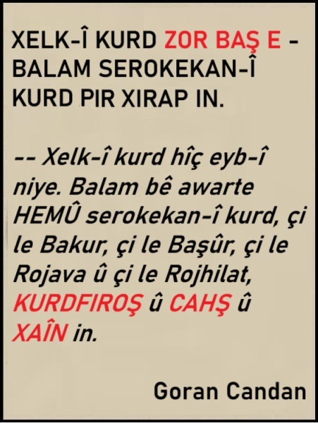 Kürd atasözü boşuna dememiş: “Çavê li deriya, xwelî li seriya” yani “Gözü hep dışarıda olanın başına toprak yağsın.” İşte o dönemin kürd liderleri tam da böyleydi; bugünküler ise onlardan da felç, onlardan da kötürüm.