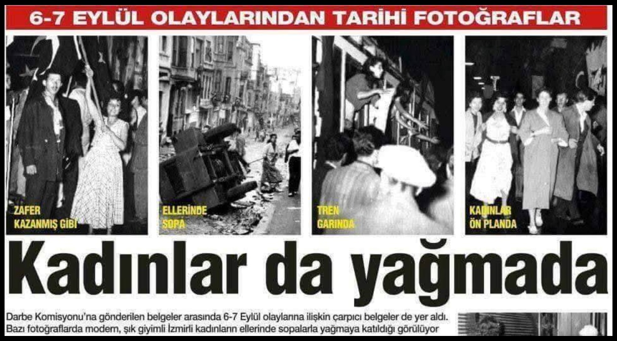 1955-6-7 Eylül'de çok yunanlı öldürüldü, kaçırtıldılar. Ev, işyerleri yağmalandı. Aynı barbarlık fazlasıyla yıllardır kürd halkı üzerinde uygulanıyor