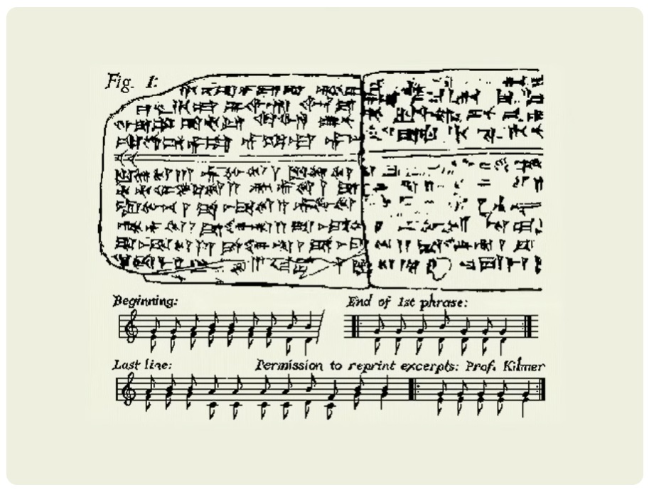 The Hurrian Hymn was discovered in the 1950s on a clay tablet inscribed with Cuneiform text. It’s the oldest surviving melody and is over 3400 years old.