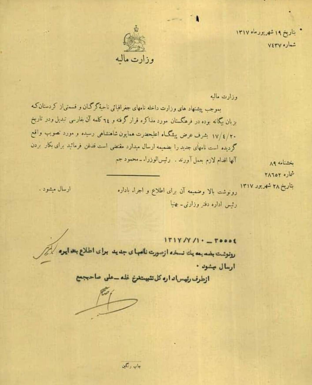 Innehåller information om att ändra och ändra namnen på de kurdiska byana och städerna till persiska